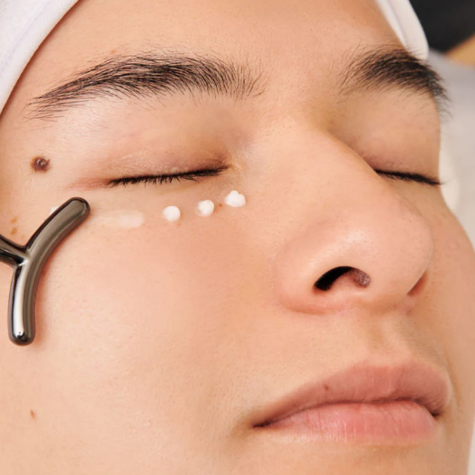 Dispense a small amount on hands, use ring finger to tap into the eye area.
